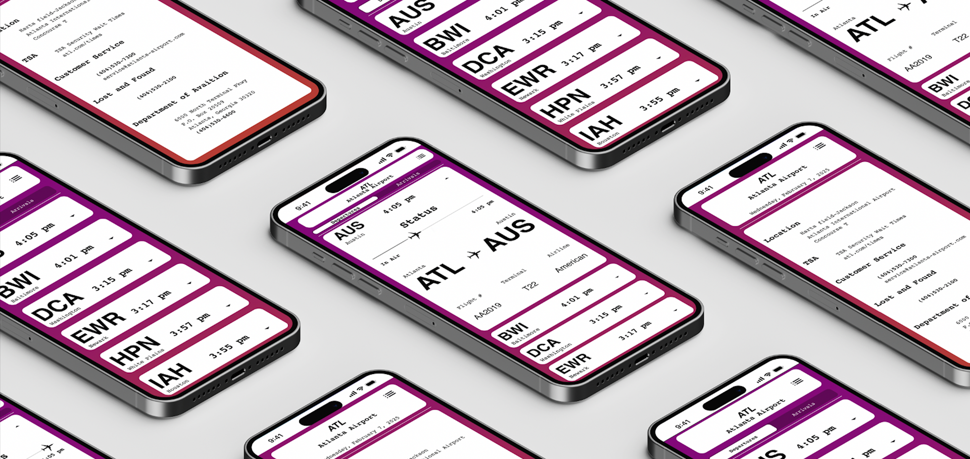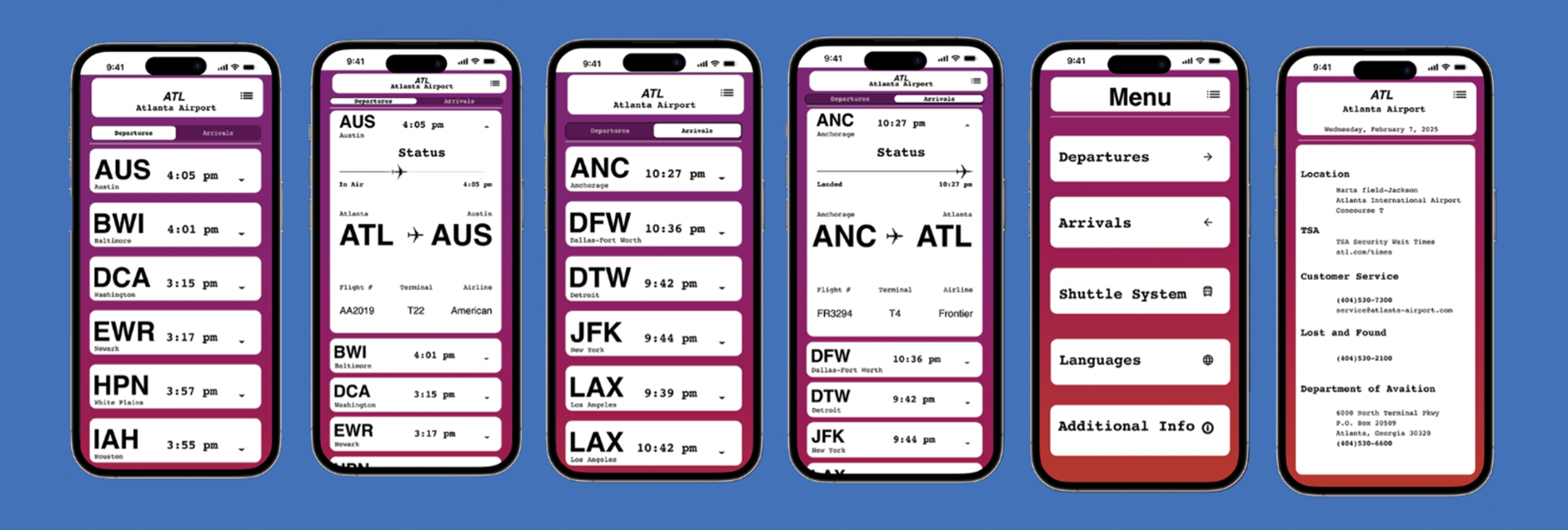 This UX/UI project is centered around designing a Flight Information Display System (FIDS) for Atlanta International Airport, specifically optimized for viewing on an iPhone 14 Pro. The system provides passengers with real-time flight updates for both arrivals and departures. The main focus of the project is to create a well-structured information layout that works seamlessly across both large and small screen formats.