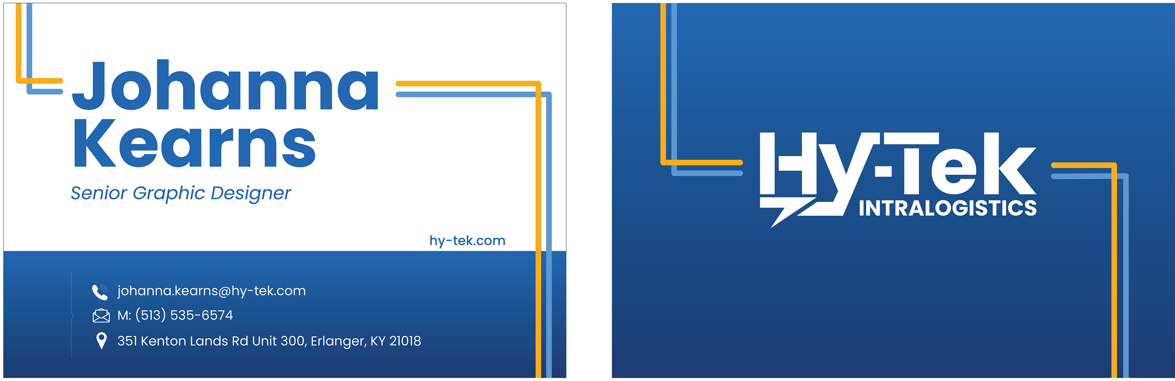 Business cards are used throughout Hy-Tek Intralogistics when meeting clients, attending trade shows, and building professional connections. While each employee has their own card, the design remains universal so the brand is easily recognizable and consistent across the company. Since the existing business cards still reflected the old branding, they no longer aligned with Hy-Tek’s rebrand. I redesigned the business cards using the updated Hy-Tek logo, brand colors, and design elements to create a more cohesive and modern look.