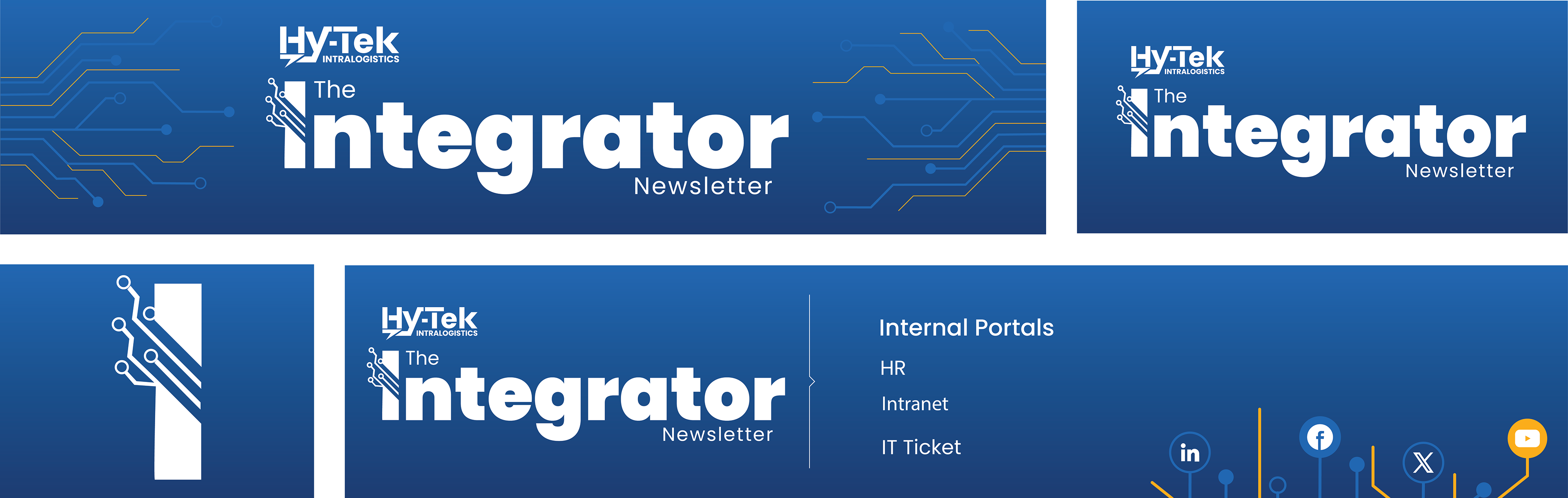 The Integrator is a company newsletter created to bridge the gaps between different teams within Hy-Tek Intralogistics and improve internal communication, making collaboration across departments feel more natural and accessible. For this project, I designed a banner for the header, a lockup design for future Integrator branding needs, a logo, and a footer, which includes the company’s social media platforms and internal portals for employees to connect with other Hy-Tek team members.